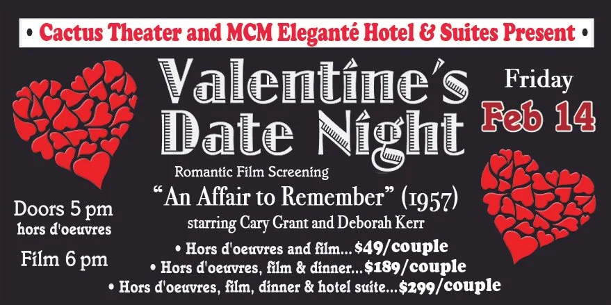 Enjoy the classic romance film “An Affair To Remember” starring Cary Grant and Deborah Kerr - preceded with heavy hors d'oeuvres - at the historic Cactus Theater (1812 Buddy Holly Ave). Doors open at 5 pm with food served adjacent to the stage/screen up until the film starts at 6 pm. Note: Single tickets are available for all packages and online ordering allows purchase of 1 or 2 tickets.
