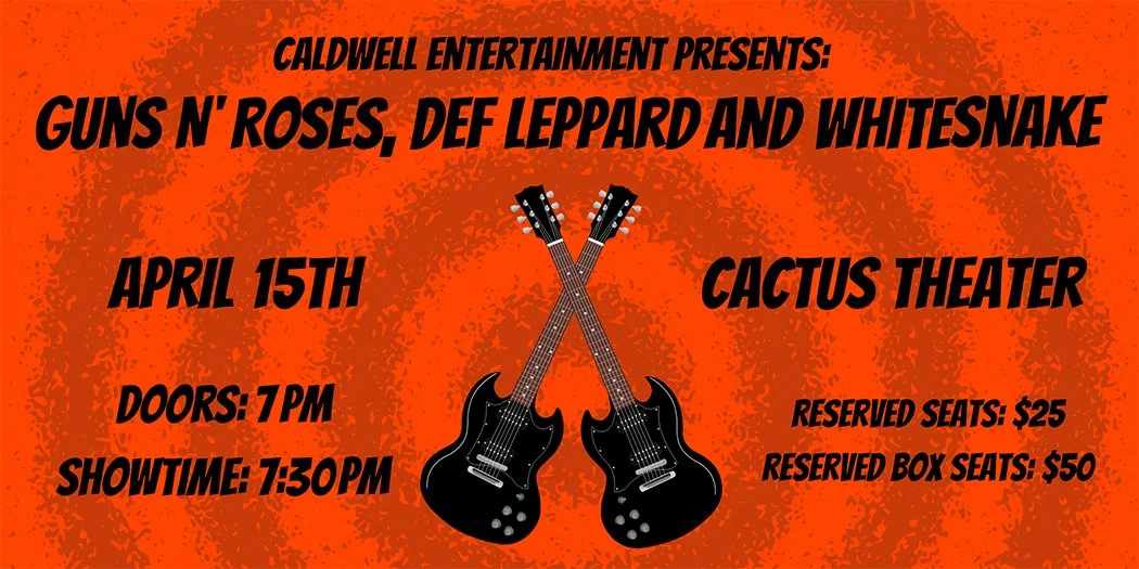 Grab your hair teaser and leather pants for this throwback to the ’80s! Caldwell Entertainment presents a night of ’80s rock ’n’ roll featuring the legendary music of Guns N’ Roses, Def Leppard and Whitesnake. This show is sure to take you on a rock ’n’ roll journey with these iconic ’80s rock bands. The incredible Caldwell Collective band and singers will take you to your feet like never before! Get your tickets NOW!!!